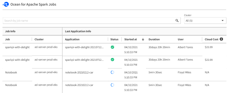 The list of Ocean Spark jobs gives you a quick view of your jobs and basic information including: